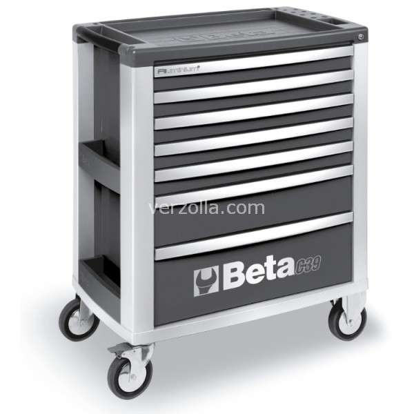 Cassettiera porta attrezzi con 7 cassetti Cassettiera portautensili con 7 cassetti da 588x367 mm, montati su guide telescopiche a sfera: • 5 cassetti altezza 70 mm • 1 cassetto altezza 140 mm • 1 cassetto altezza 210 mm Caratteristiche: • Piano dei cassetti protetto da tappetini di gomma espansa • Quattro ruote Ø 125 mm di cui 2 fisse e 2 girevoli (una con freno) • Serratura di sicurezza centralizzata frontale • Sistema di apertura a sgancio rapido in alluminio posizionato su tutta la lunghezza del cassetto • Capacità di carico statico pari a 1200 kg • Piano di lavoro termoplastico • Portaflaconi laterali e posteriori integrati • Portacarta integrato • Struttura portante in alluminio leggera e resistente