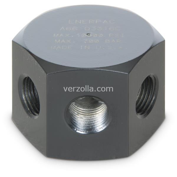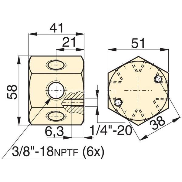 Manifold esagonale con 6 bocche. I tappi sono forniti per tutte le bocche 3/8"-18 NPTF.