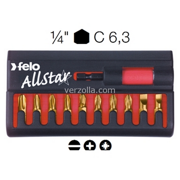 Per uso a mano e a macchinaMod. AllStar, in astuccio di plasticaTipo con 11 utensili - 2 inserti per viti con intaglio 5,5 - 6,5 mm4 inserti per viti a croce «PHILLIPS» - Punta DIN 2 (3 pezzi) - 34 inserti per viti a croce «POZIDRIV» - Punta 2 (3 pezzi) - 31 raccordo per inserti magnetico A 1589/45 con attacco " - Attacco E 6,3A 1594/1 - Con inserti standardA 1594/2 - Con inserti rivestiti al TiNA 1594/3 - Con inserti rivestiti al diamante