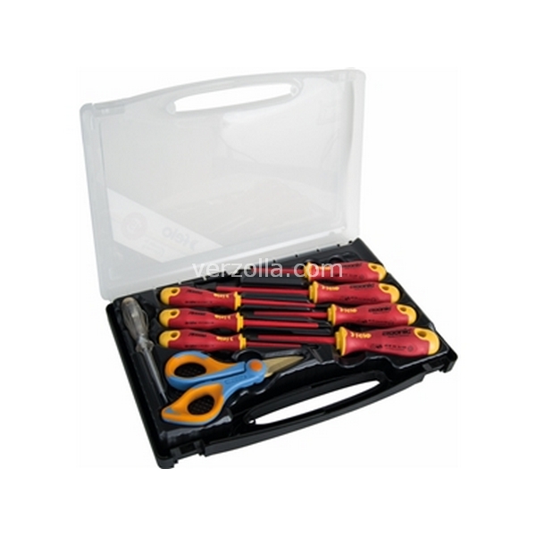 Con 7 giraviti cercafase e forbici5 giraviti per viti con intaglio M 7099 da 2,5x75 - 3,0x100 - 3,5x100 - 4,0x100 - 5,5x125 mm2 giraviti per viti a croce «PHILLIPS» M 7101/3 - Punta DIN 1 - 21 cercafase per viti ad intaglio A 1502/5 con lama lunghezza 70 mm1 paio di forbici B 2184/2 con lame in acciaio inossidabile rivestite al TiNIn pratica valigetta di plastica trasparente infrangibile