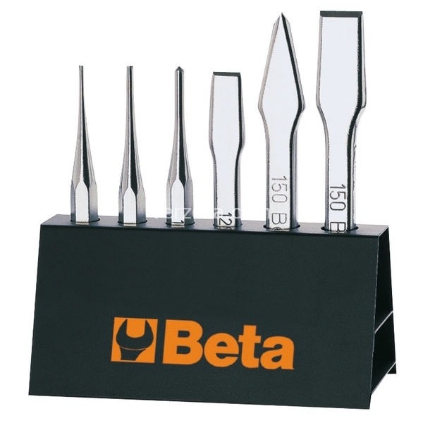 Serie di 6 punzoni (art. 30), bulini (art. 32), scalpelli piatti (art. 34) e ugnetti (art. 36), con supporto