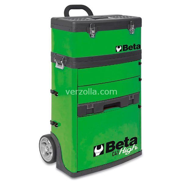 Trolley portautensili a 2 moduli sovrapponibili Caratteristiche principali:  • Struttura in lamiera e piani in materiale plastico: grande robustezza e peso ridotto • 2 moduli separabili: • 1 cestello superiore • 1 modulo con 2 cassetti altezza 95 mm • 1 cassetta estraibile in materiale plastico altezza 66 mm e 1 cassetto altezza 295 mm • Ruote di grosso diametro (160 mm), integrate nella struttura per facilitare  il trasporto anche su gradini • Serratura centralizzata laterale per la chiusura dei cassetti del modulo inferiore • Cassetti montati su guide telescopiche a sfera con doppio gancio di chiusura • Impugnatura con manico telescopico in alluminio • Portaminuterie integrato  • Cassetto inferiore con doppia guida telescopica • Assortimenti consigliati: 5940/SBK, 5915VU/5 e 5941VU-M * Colorazioni disponibili su richiesta