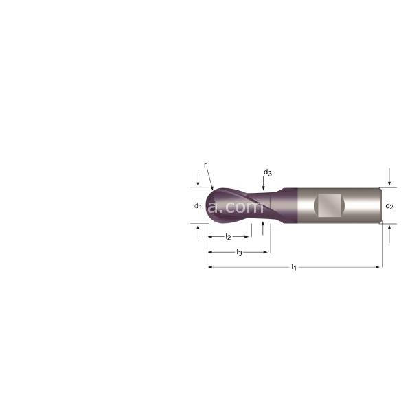 Fresa semisferica a 2 taglienti serie corta in HSS-E acciaio super-repido al cobalto, trattamento superficiale al carbo-nitruro di tianio TiCN, forma standard N , angolo elica 30°, codolo cilindrico con cava di bloccaggio 1835B, normativa DIN327D